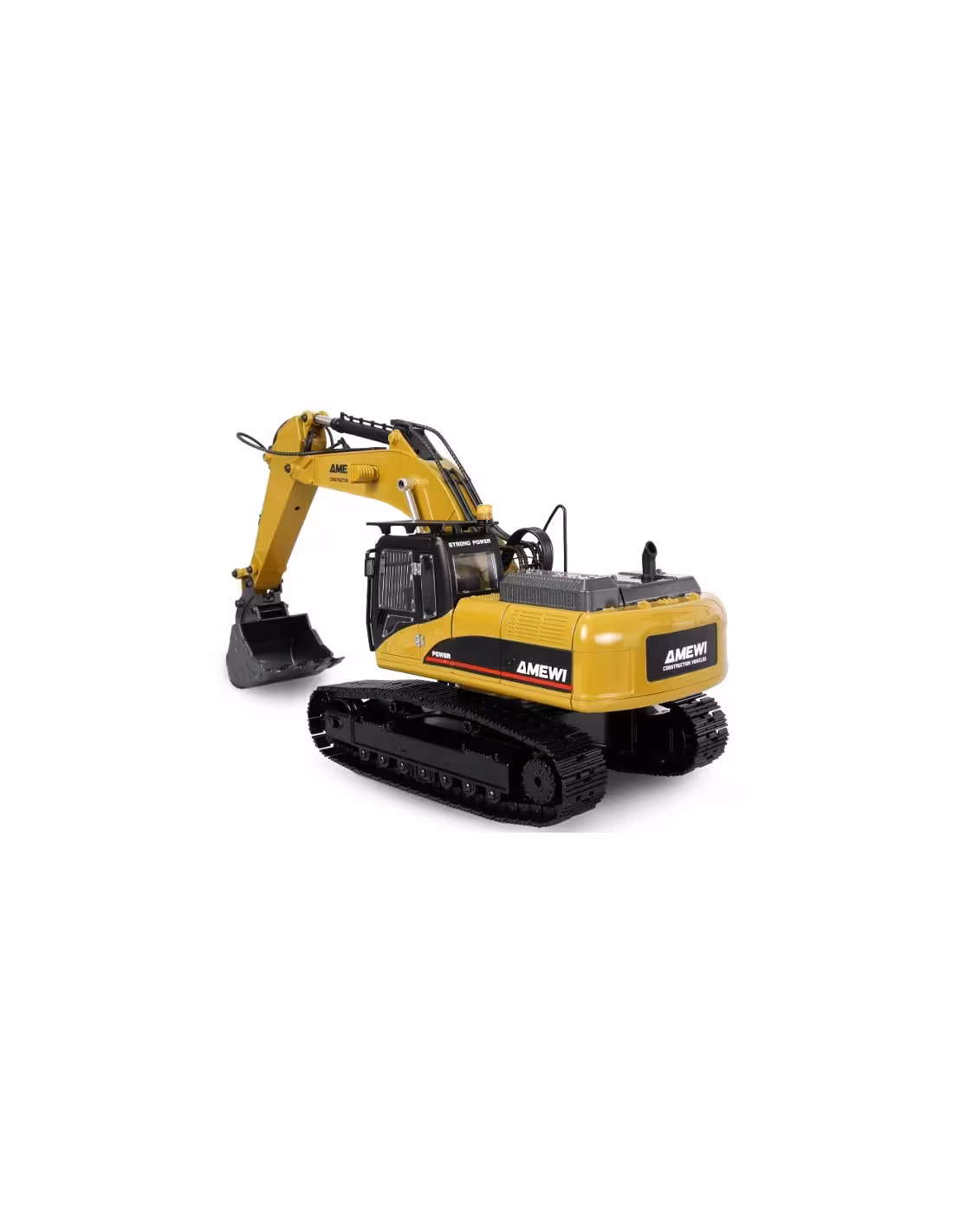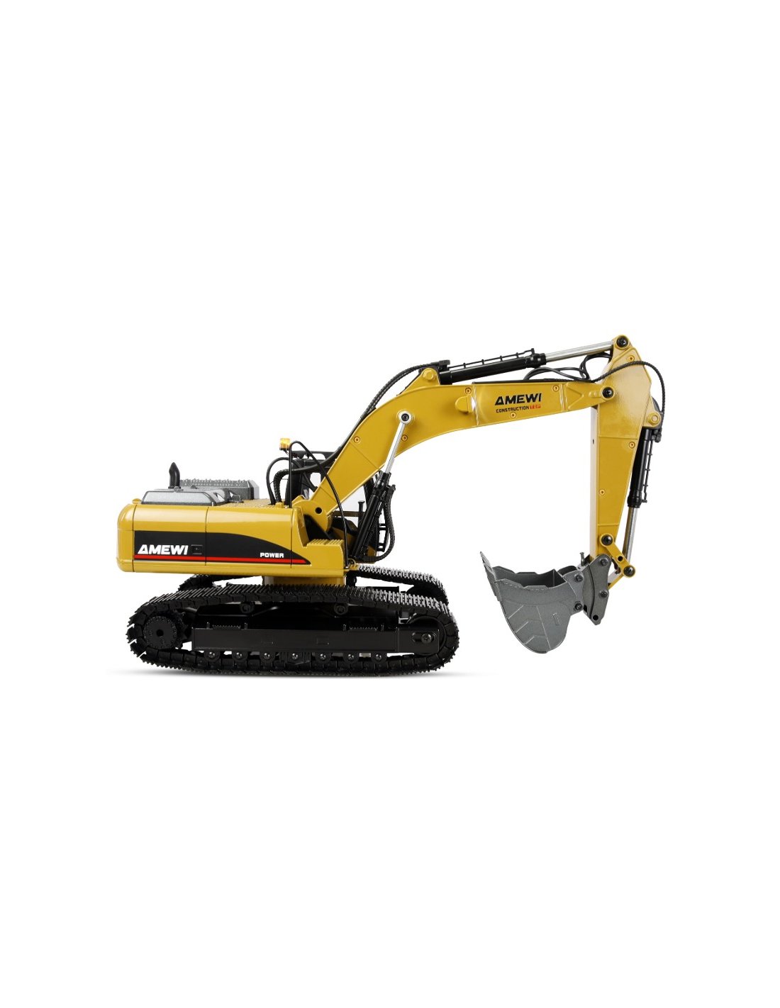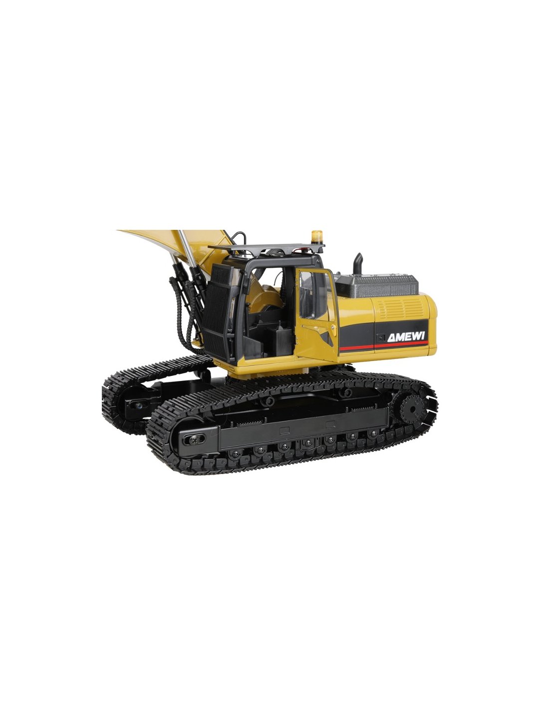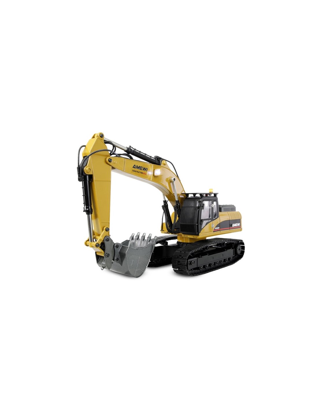 La télécommande 14 canaux de haute qualité permet un contrôle proportionnel de tous les mouvements, y compris ceux des chenilles, pour une maniabilité précise et sensible de la pelle. Le système 2,4 GHz sans interférences garantit une transmission du signal fiable. Livré en kit RTR (Ready-to-Run) – comprenant télécommande, batterie et chargeur –, le modèle est préréglé et calibré en usine et prêt à l'emploi.