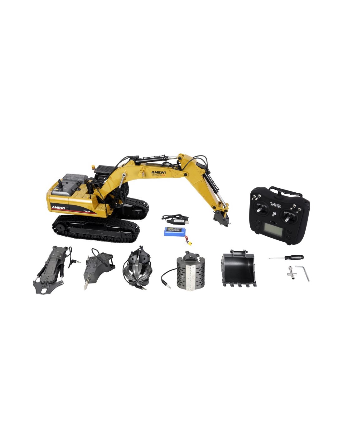 Contenu de la livraison XXL : Attache rapide (mécanique), marteau perforateur, cisaille à démolition, pince à ferraille et pince de tri rotative incluses. Tous les accessoires sont électriques et télécommandables.Poids élevé d'environ 8,7 kg. Modèle entièrement métallique pour une utilisation optimale sur toutes les surfaces . Éclairage LED avec gyrophare et signal sonore activables à distance : crée une ambiance de travail idéale.