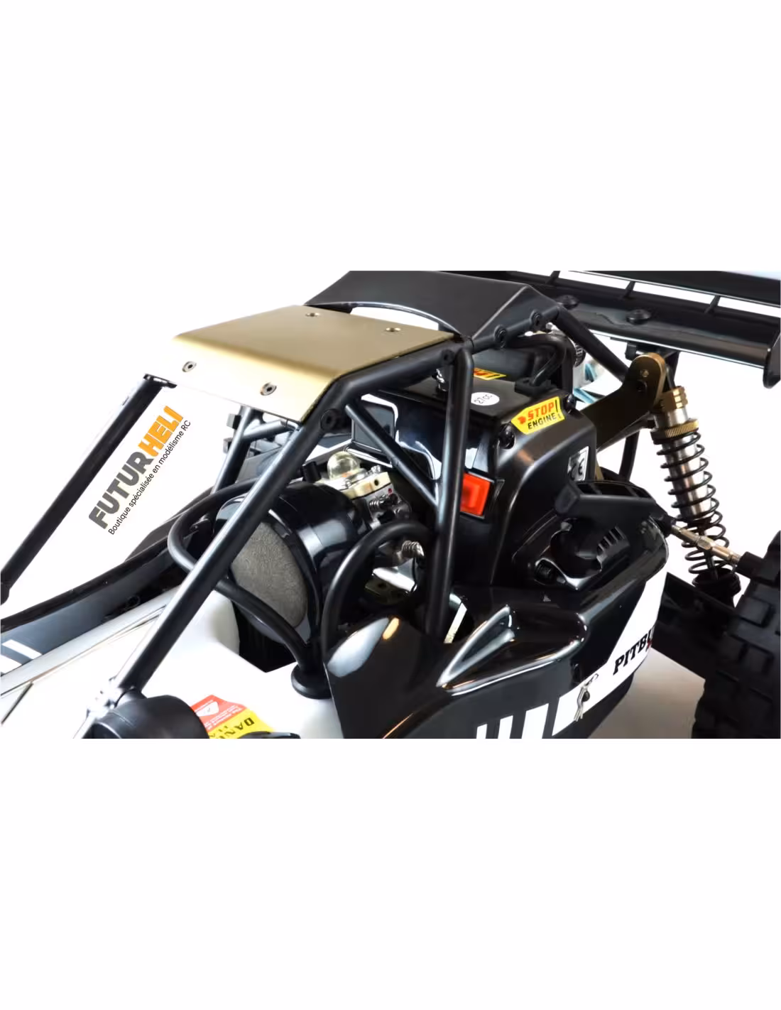 La version du Pitbull au 1/5 ème a beaucoup évolué et se nomme maintenant X évolution . Il est équipé du nouveau moteur 27cc 2 temps de 2,7cv .Beaucoup de modifications comme les roues les moyeux le servo de direction passe à 62kg et l'asservissement de l'ensemble Gaz/frein est confié à un servo de 18kg . Beaucoup de pièces en aluminium ainsi que de nombreux renforts ont été ajoutés .