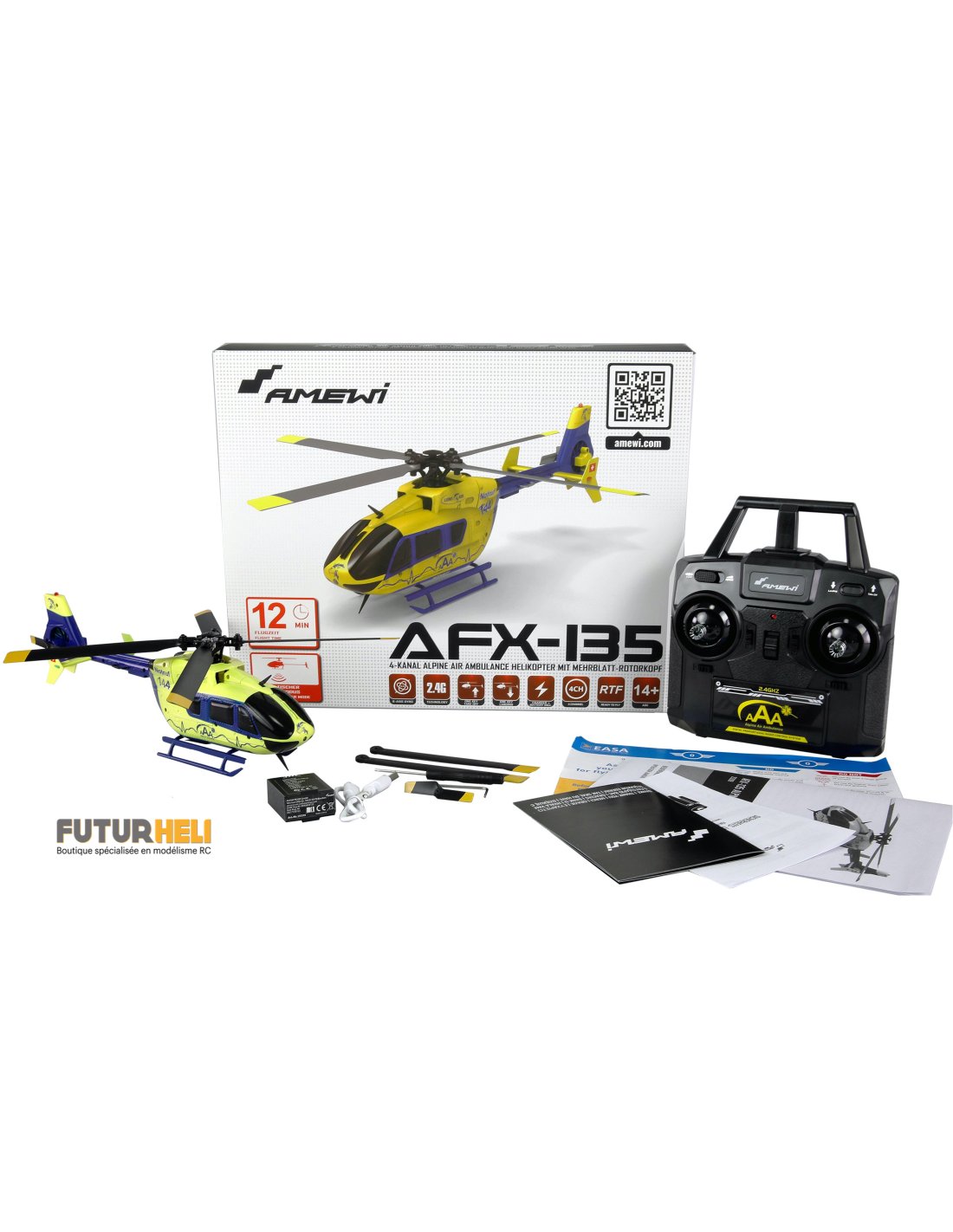 Il est livré en version RTF (Ready-to-Fly), ce qui signifie que tous les composants – à l'exception des piles domestiques standard pour la télécommande – sont déjà inclus dans l'emballage et que l'hélicoptère peut voler immédiatement après avoir chargé la batterie.