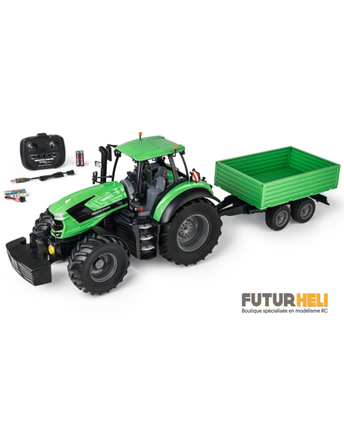 Découvrez la précision et la performance ultimes avec le modèle Deutz-Fahr 8280 TTV – un tracteur RC fidèle à l’original et entièrement fonctionnel, conçu pour les conducteurs exigeants !Équipé d’une télécommande 2,4 GHz, ce modèle permet l’activation contrôlée du bruit du moteur, du klaxon et de la fonction de basculement électronique de la remorque. L’éclairage LED à l’avant intégré offre une expérience de conduite réaliste, tandis que le petit rayon de braquage et la direction puissante garantissent une maniabilité optimale.La réplique sous licence officielle Deutz-Fahr séduit avec ses pneus tout-terrain à profil profond pour une traction maximale et son essieu rigide qui améliore les performances en terrain difficile. Le compartiment de batterie facilement accessible sous le capot permet un remplacement rapide et une reprise immédiate de la conduite – pour une autonomie impressionnante allant jusqu’à 90 minutes !