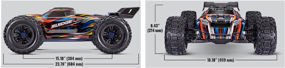 Sledge Traxxas 1/8 ème Brushless 4x4 jusqu'à 115 km/h . le Sledge a été pensé pour dépasser vos attentes en termes de qualité, de solidité et de plaisir. Le châssis ultra-robuste, la transmission massive en acier, la puissance féroce délivrée par les batteries 6s et la tenue de route inspirée de la course laissent tous ses concurrents dans la poussière. Les nouveaux pneus gainés Sledgehammer limitent leur centrifugation à haute vitesse pour une surface de contact plus grande et plus lisse, offrant une précision et un contrôle à haute vitesse jamais vus.