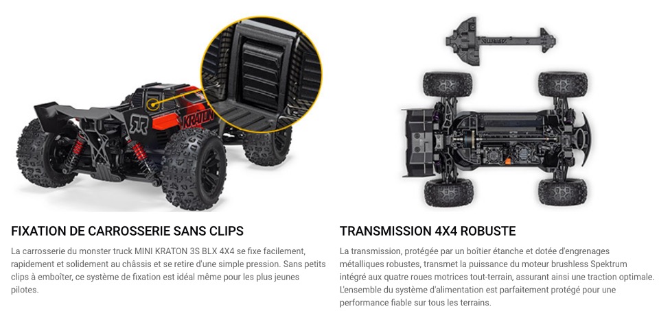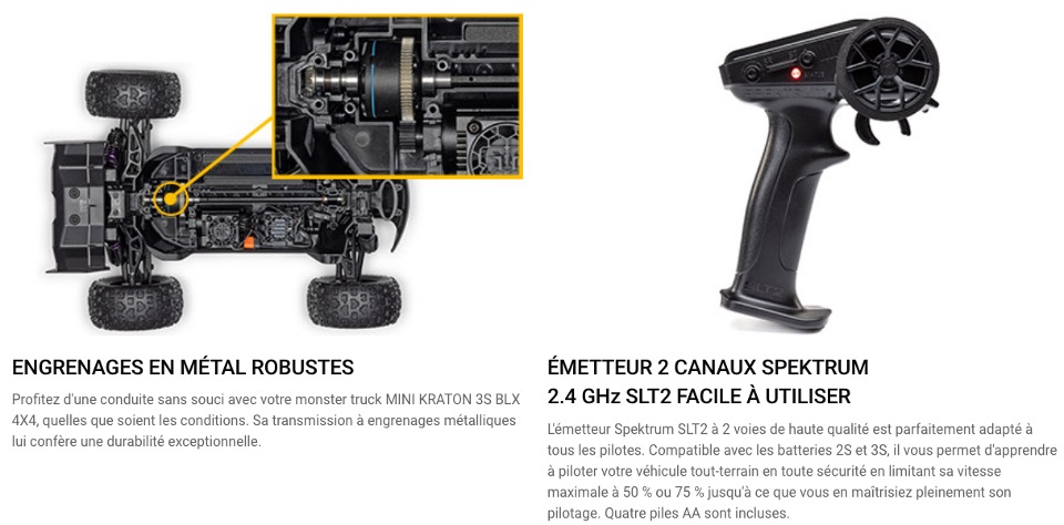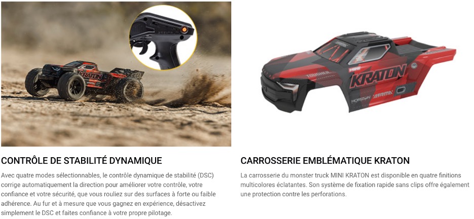 Arrma nous propose son Mini-Kraton le concurrent direct de la série Mini de chez Traxxas à l'chelle 1/16 ème . Un système innovant dans ce modèle c'est la possibilité de brider à 45 KM et de doubler l'autonomie ou de rouler pleine puissance jusqu'à 80 KM/H ceci tout simplement à une clé " Power key " que l'on introduit dans le véhicule ( fourni dans la boite ) . Il bénéficie des dernières innovations comme la carrosserie sans clips , engrenage metal ,transmission 4WD et émetteur en 2,4 ghz équipé du DSC à 4 mode qui contrôle la trajectoire il est possible de le désactiver depuis la radio pour les pilotes les plus aguerris .