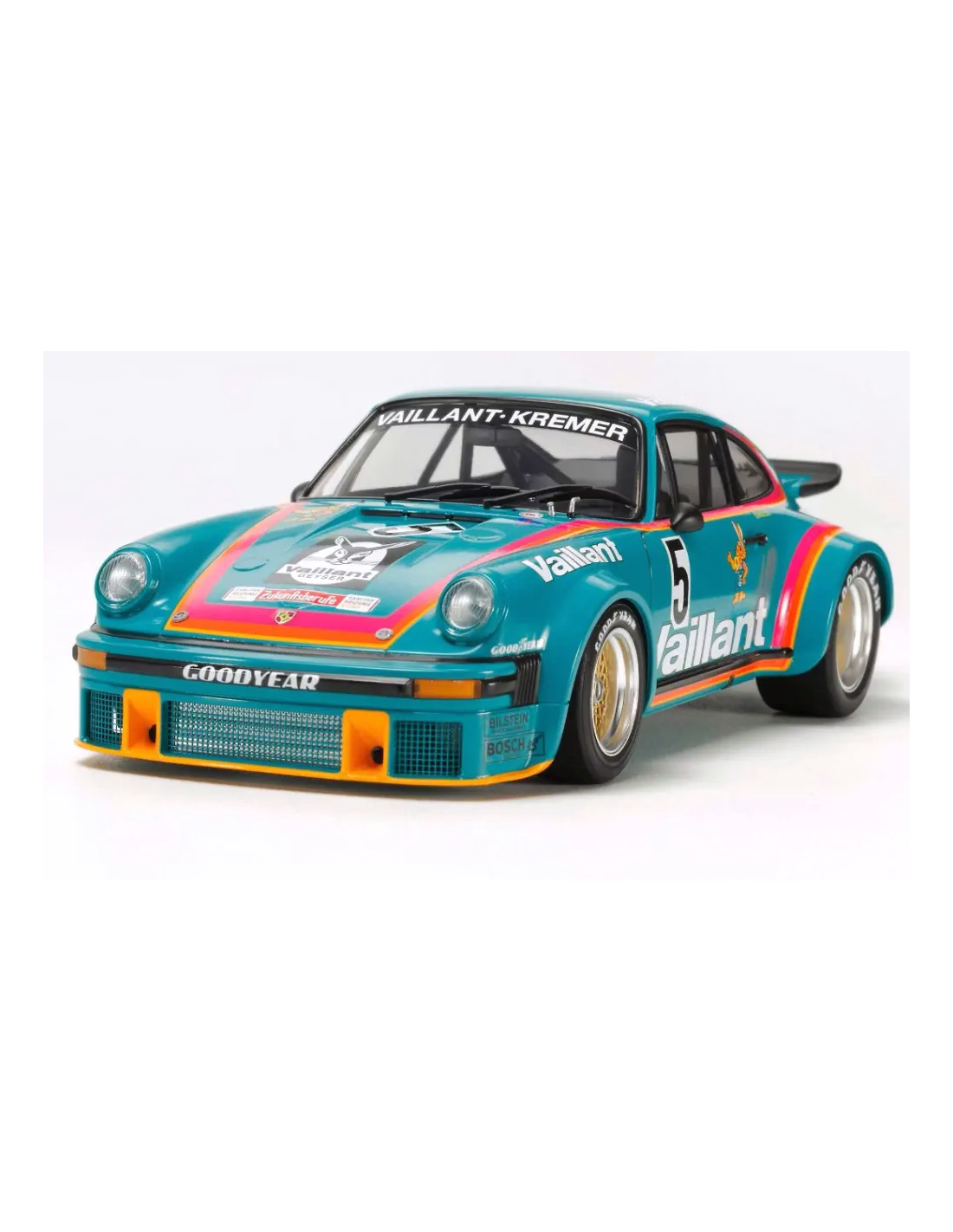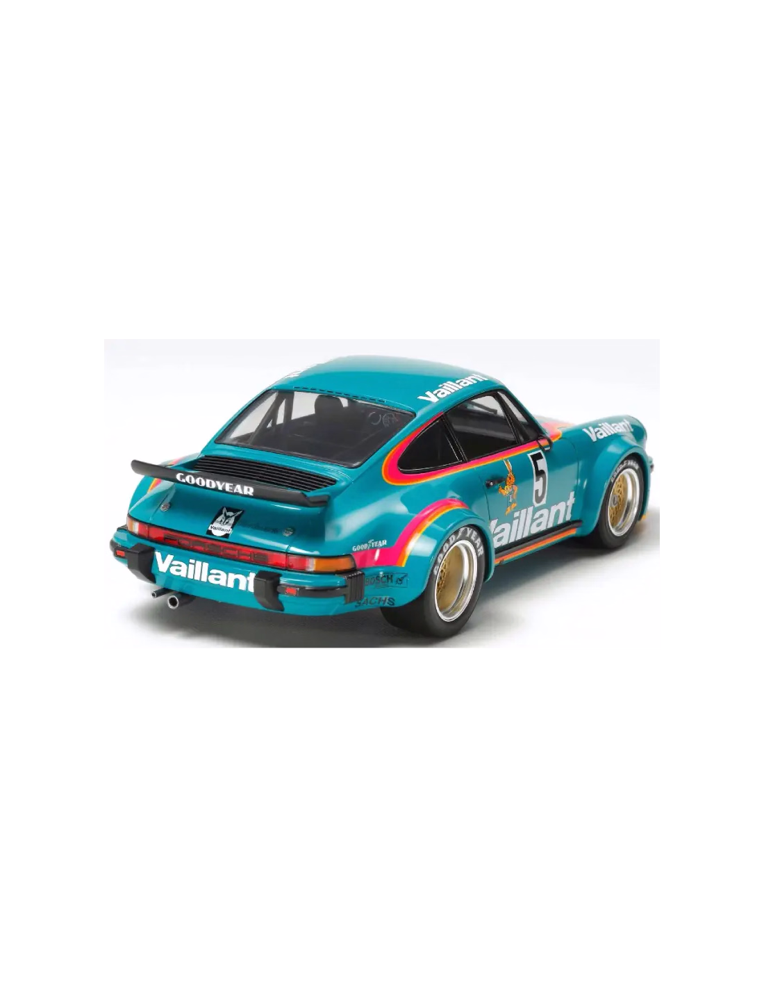 Magnifique maquette de la porsche Vaillant à l'échelle 1/24 de chez Tamiya référence 24334 .Le modèle reproduit fidèlement la forme de la voiture de course avec ses ailes élargies et son grand aileron arrière qui se démarquait considérablement de la version routière du véhicule. Il reproduit fidèlement des détails tels que l’arceau de sécurité intérieur, la suspension et le dessous du châssis.