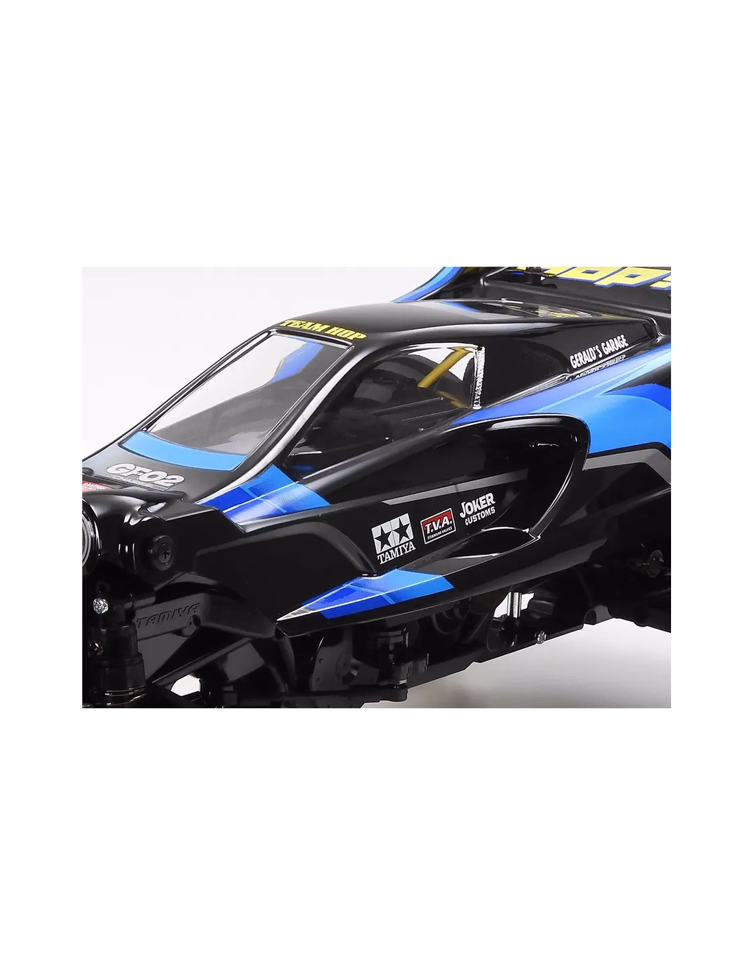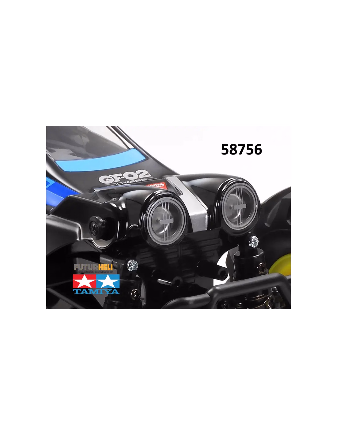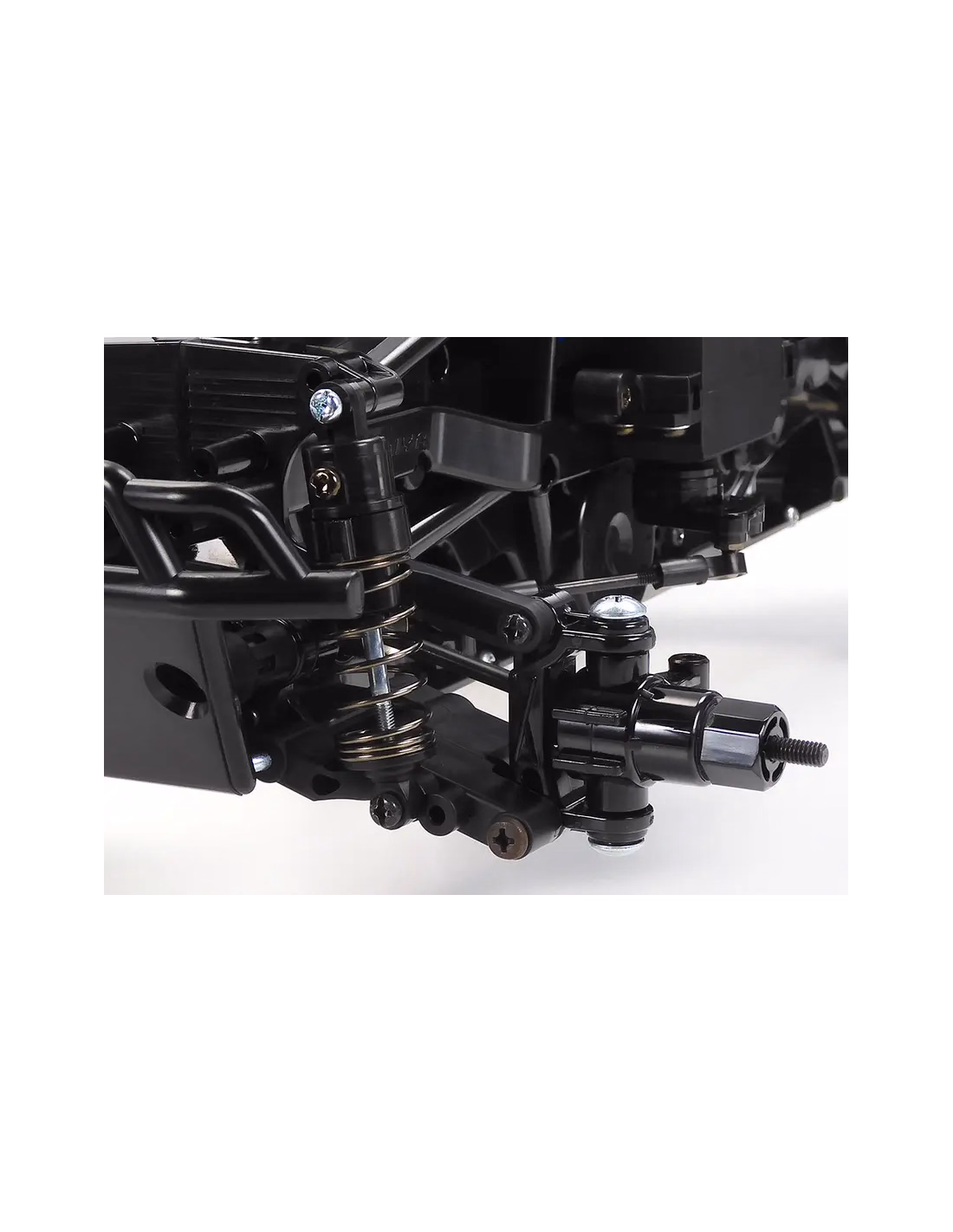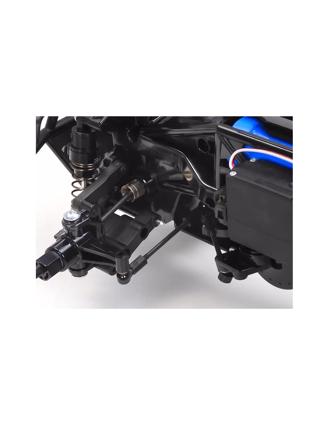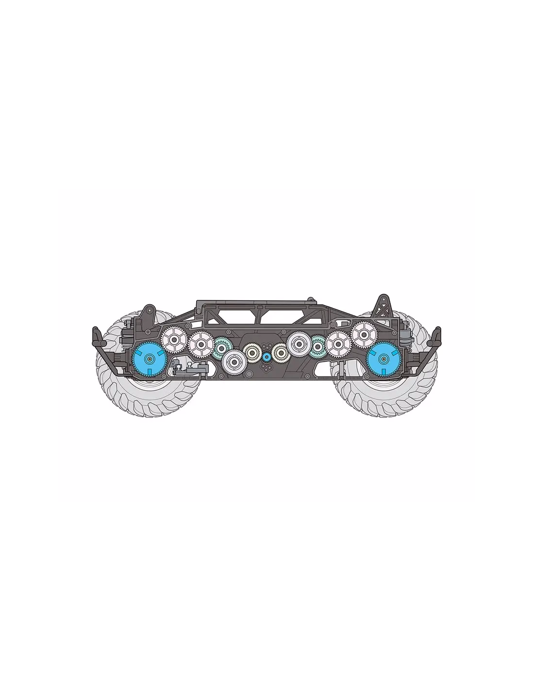 le châssis GF-02 à quatre roues motrices et transmission par engrenages est doté d'un moteur en position basse et centrale, intégré à un cadre monocoque léger et robuste. La puissance est transmise aux essieux avant et arrière par engrenages. L'empattement long et la voie large garantissent une excellente stabilité en tout-terrain. Le cadre fin présente des lignes tubulaires et intègre des boîtes de vitesses étanches qui empêchent les projections de pierres. Les différentiels à engrenages avant et arrière assurent une bonne tenue de route en virage, tandis que les pignons (vendus séparément) offrent trois rapports de transmission au choix. Un carter moteur renforce la fiabilité en tout-terrain. La suspension à quatre roues à double triangulation est équipée de quatre amortisseurs à friction. Le servo de direction est positionné à gauche et les biellettes de direction sont de même longueur.