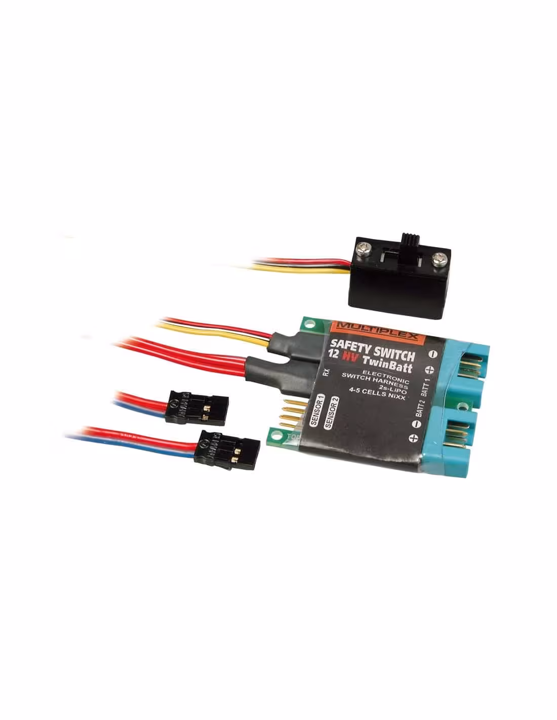 • Côté récepteur, SAFETY-SWITCH 12HV TwinBatt (M6) système de prise M6. Permet un branchement direct sur les récepteurs MULTIPLEX RX-9/12/16-DR pro M-LINK ou sur les récepteurs MULTIPLEX M-PCM RX-9/12-SYNTH DS M-PCM.