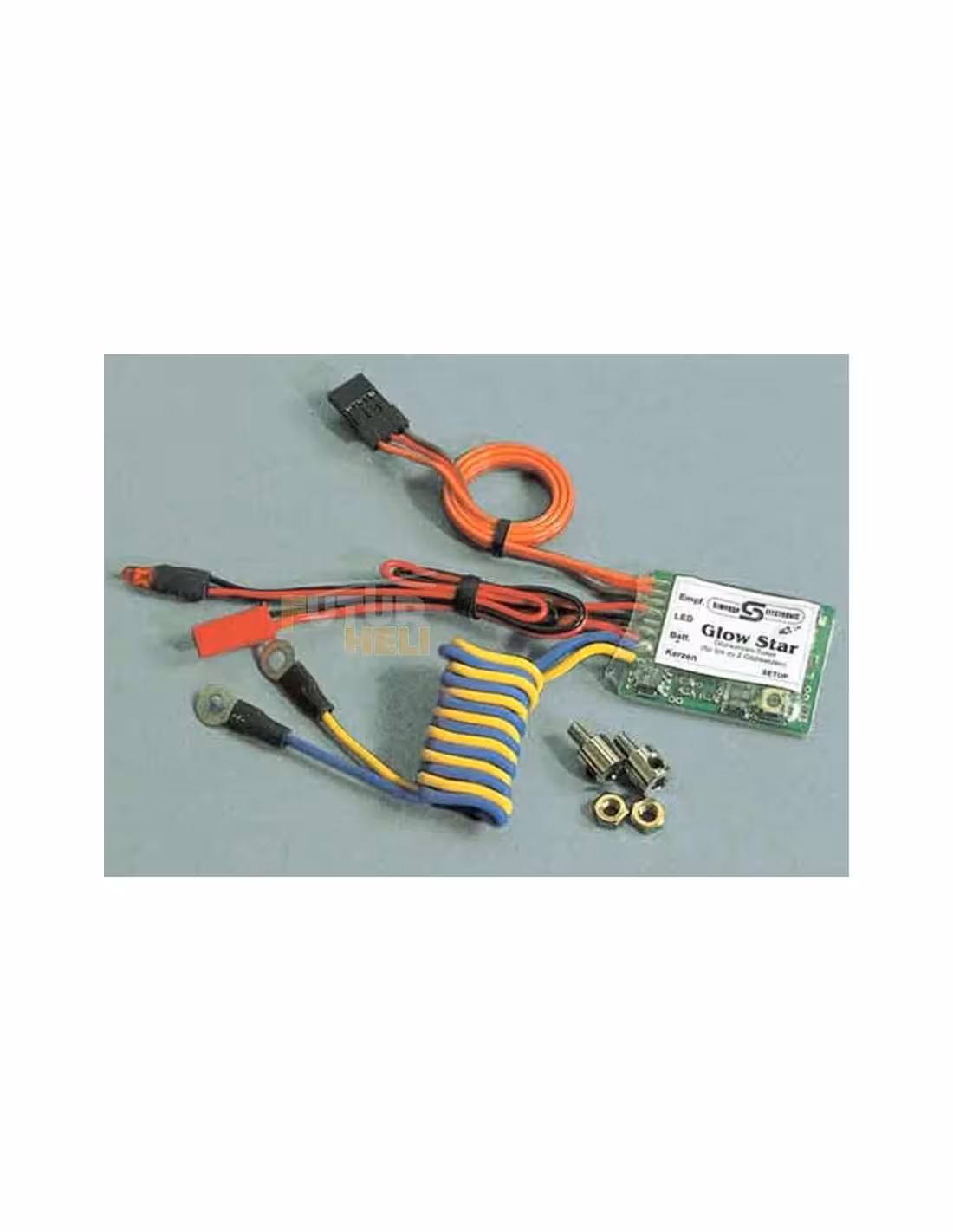 GLOW STAR ré-alimentation 1 à 2 bougies Simprop,Système de ré-alimentation automatique pour 1 ou 2 bougies. En dessous d’un certain régime moteur, réglé par potentiomètre, le Glow Star se met en service et alimente les bougies en courant électrique, ce qui permet d’obtenir des régimes de ralenti moteur très bas et très stables.