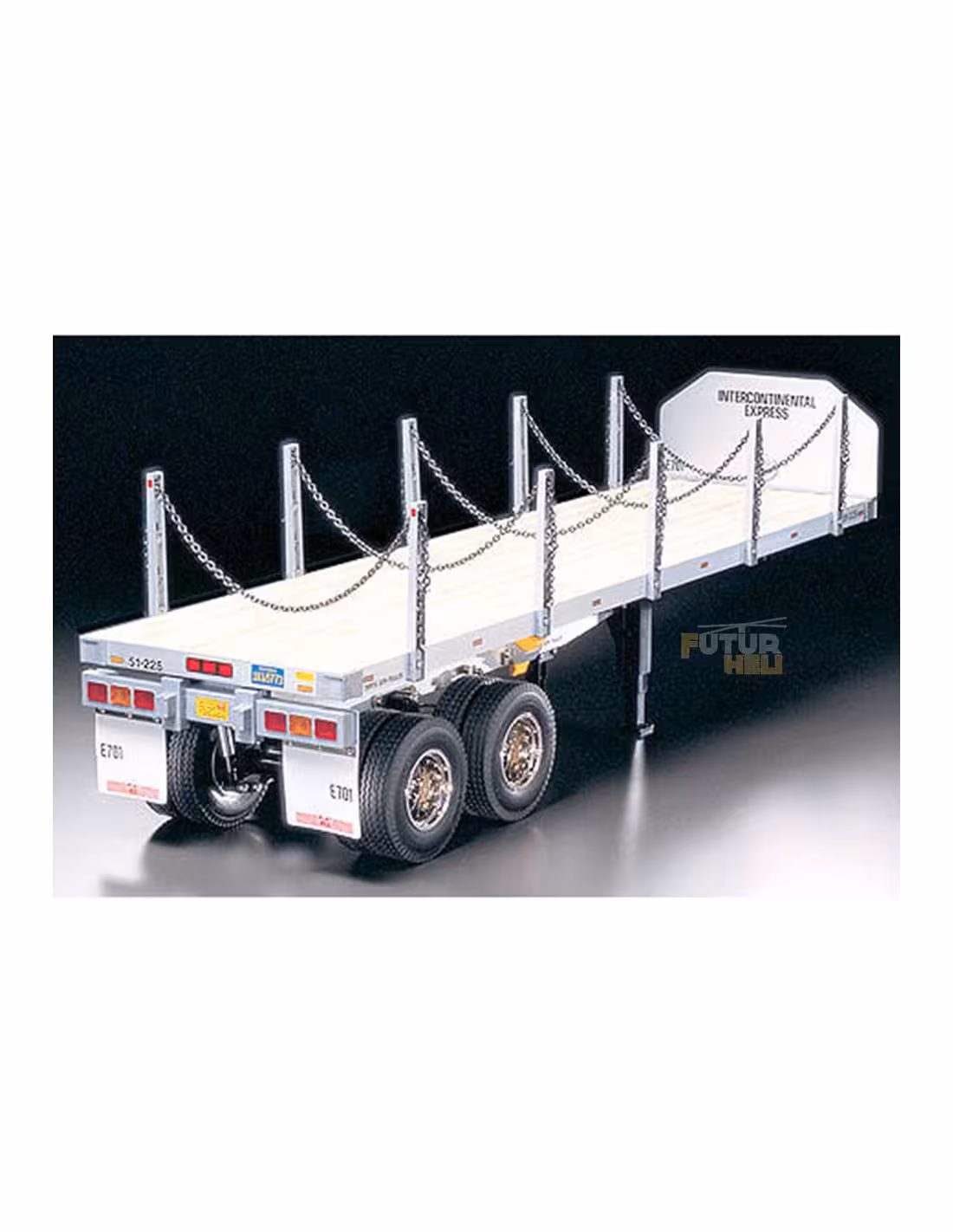 Tamiya propose une nouvelle semi-remorque qui peut être associée aux tracteurs 1/14. Ce plateau est composé d'une plateforme en bois, de longerons alu, et de supports alu avec des chaines, qui donnent un aspect très réaliste à ce modèle.