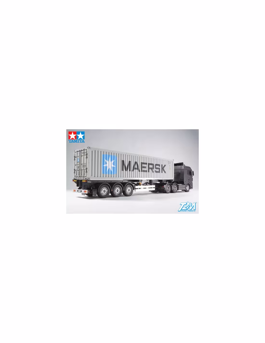 - Semi-remorque type européen capable de recevoir deux containers 20’ ou un container 40’. Le kit inclut un container 40’ méticuleusement détaillé avec les marquages de la compagnie de fret international Maersk. Un système de verrouillage similaire à celui vu dans la réalité permet de fixer/détacher le container sur la remorque.