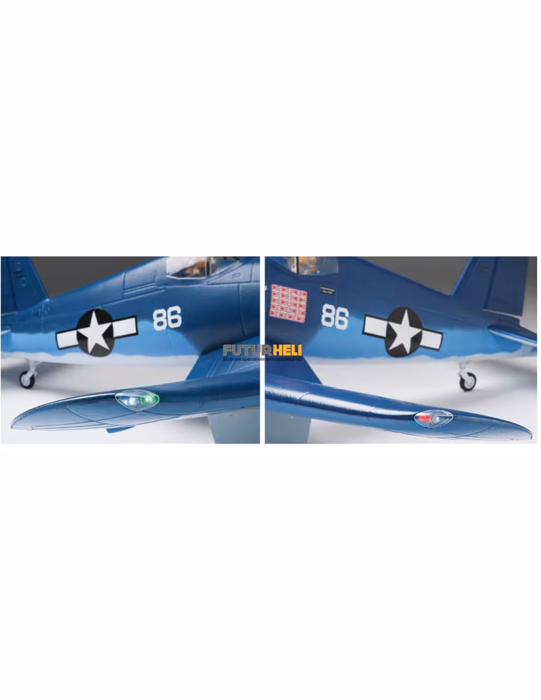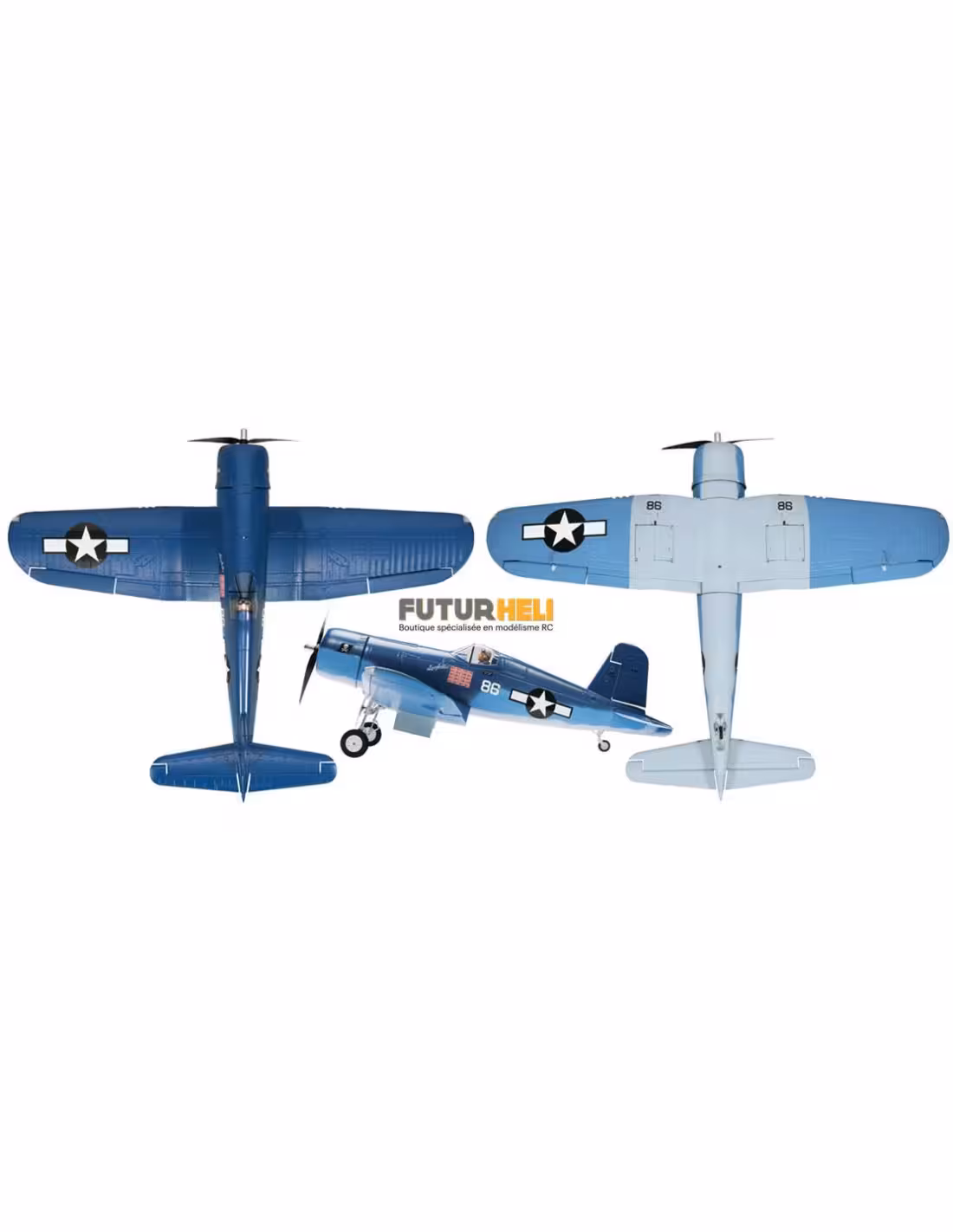 F4U Corsair Flyzone une très belle réplique pleines de détails comme le feu de navigation le train d'atterrissage rentrant avec trappes .Il est constuit en EPP mousse " Aerocell "très résitant au chocs .il est livré avec la motorisation les servos et un récepteur Tratic SLT il est compatible avec les émetteurs et module Tx TACTIC SLT