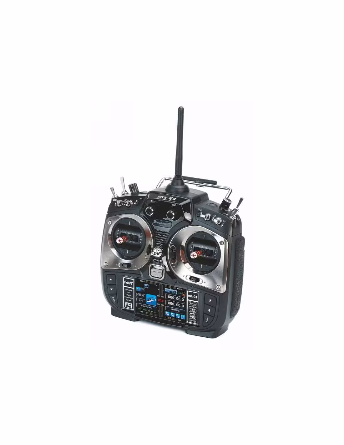 Voici la MZ-24 HoTT : Radio 12 voies 2.4 GHz Graupner/SJ. La technologie de télémesure « maison » de Graupner/SJ, en 2.4 GHz, prend en charge la transmission de données bidirectionnelles et donne à l'utilisateur des informations en temps réel telles que par exemple : la hauteur du modèle, sa distance, sa vitesse' L'utilisation d'un maximum de 75 canaux avec sauts de fréquence assure une fiabilité de fonctionnement extrême et une protection totale face aux perturbations grâce aux sauts de fréquences optimisés sur une grande largeur de bande.