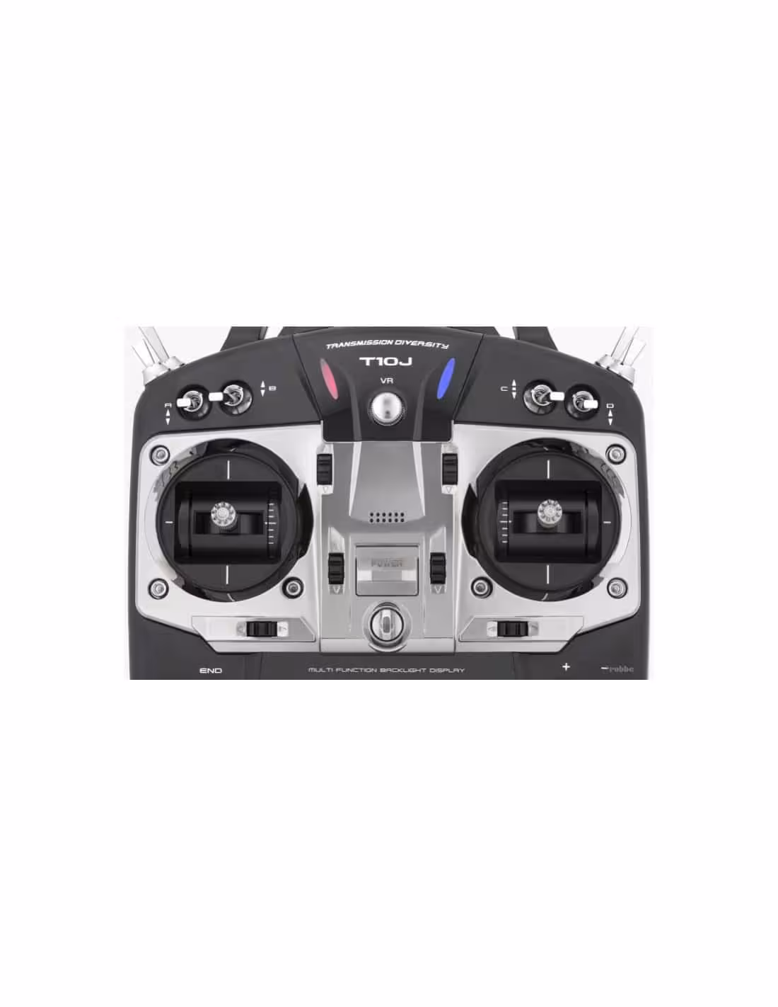 - Emetteur T10J 2,4 GHz T/S-FHSS en MODE 1 (manche de gauche : profondeur-dérive, manche de droite : moteur-ailerons)