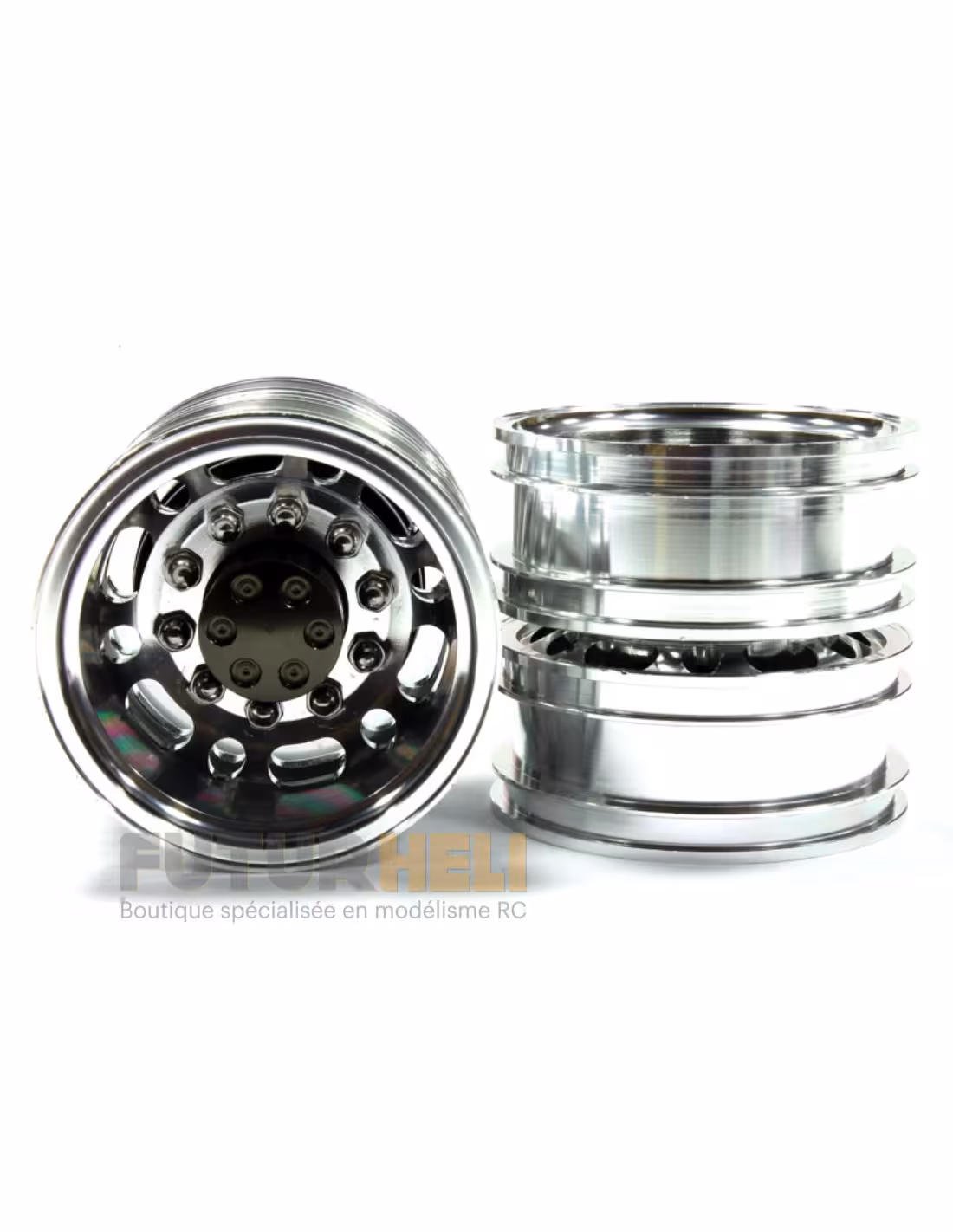 Jante aliage 12R usiné avec centre rouge livré 2 pièces , chaque paire comprend un outil pour le démontage de la flasque centrale.Mettez un look maquette a votre camion Tamiya