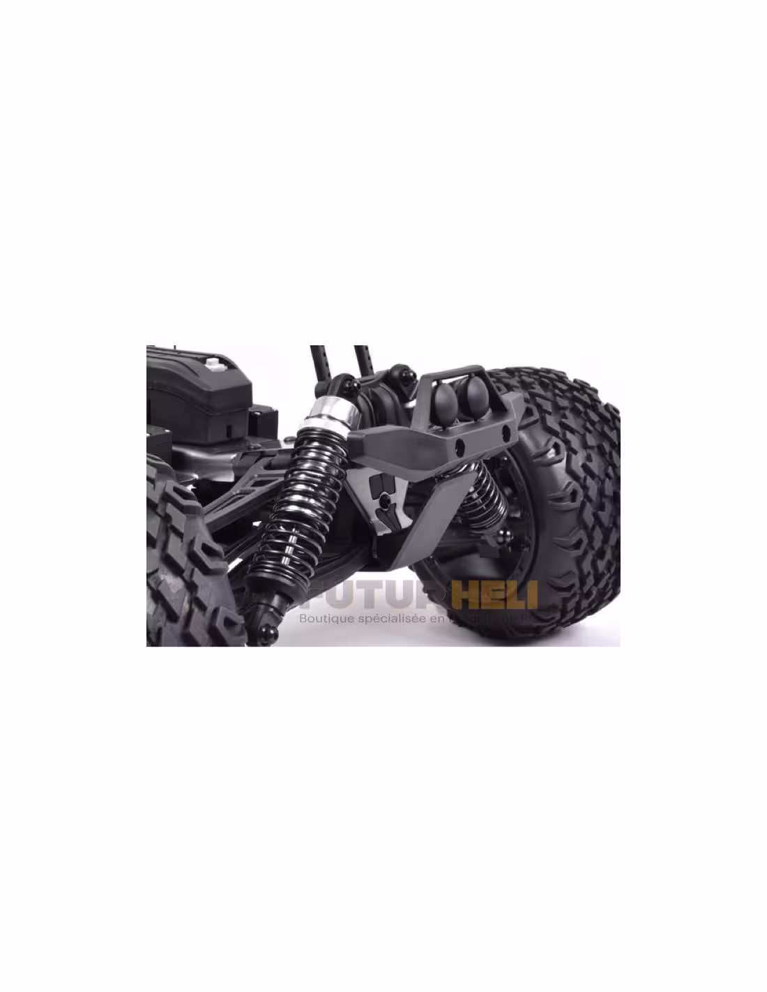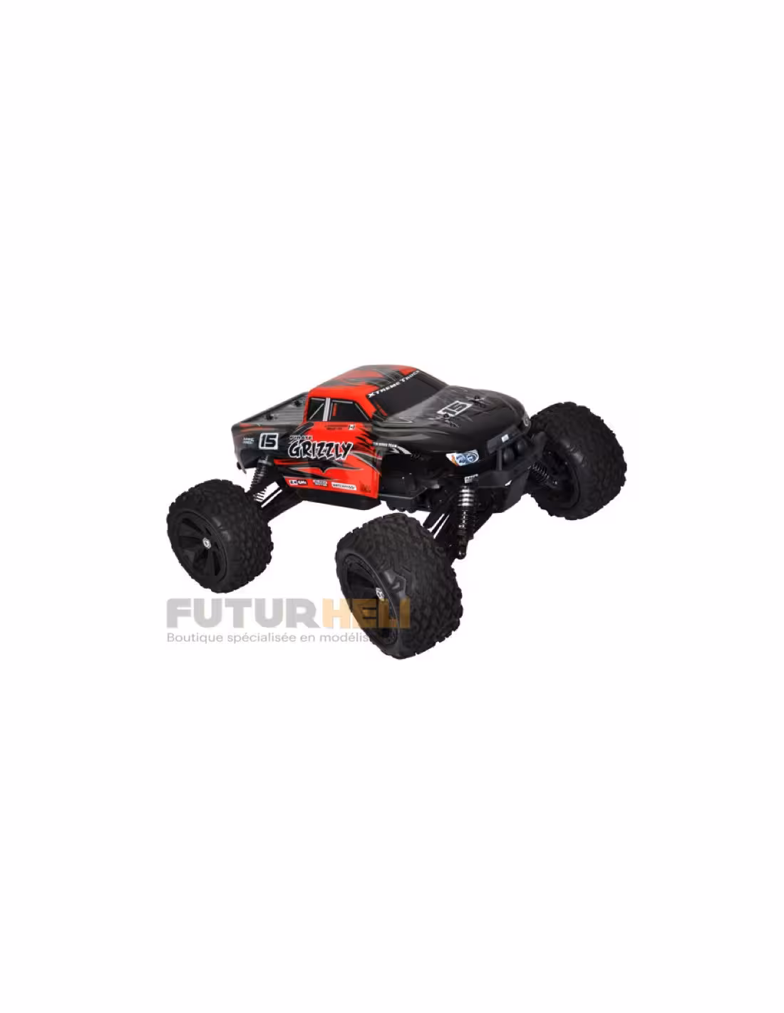 Monster Truck RC Brushless, équipé d’un puissant moteur brushless, d’une transmission intégrale à trois différentiels et d’une robuste suspension à quatre roues indépendantes complétée par des amortisseurs hydrauliques grand volume et des pneus surdimensionnés, le Pirate Grizzly est très rapide et peut franchir les obstacles sans problème. Le look n’est pas en reste avec une superbe carrosserie peinte et décorée d’origine.